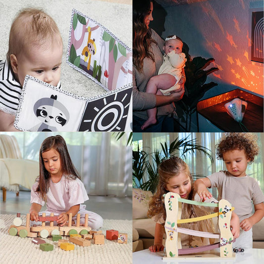 Boho Chic Bundle: Tiny Dreamer 3-in-1 Musical Projector, Double-Sided First Book, Wooden Car Ramp, Wooden Stacking Train