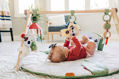 The Boho Chic Luxe Developmental Gymini’s earthy colors, fun textures and engaging sounds stimulate babies’ senses from the very first days. The wonderful collection of activities and toys will inspire your baby to practice skills and spend more time in tummy time. While lying on their backs, let your baby practice hand-eye coordination by trying to reach out and touch the eucalyptus mobile and wooden ring trio.
