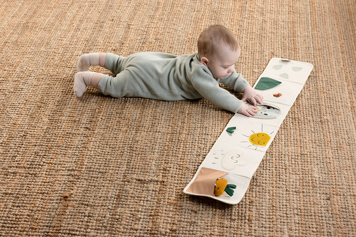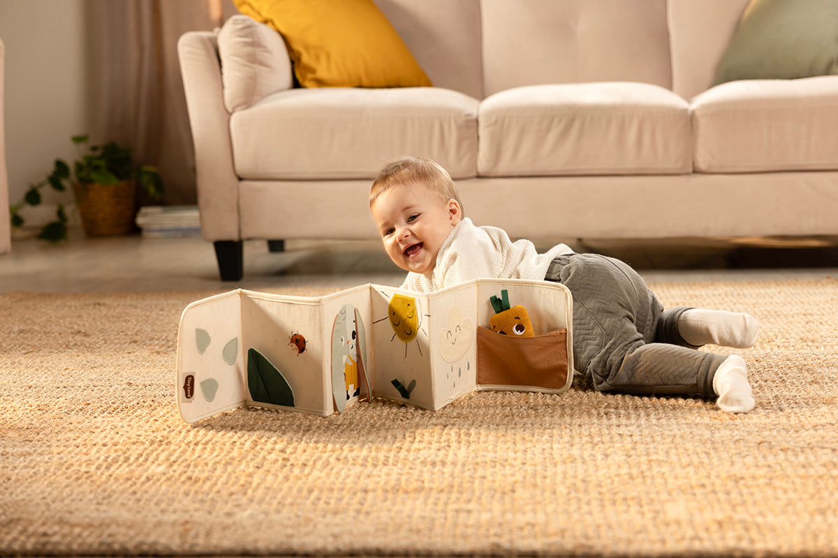 Both sides will engage and stimulate babies at earlier and later stages of development, helping extend tummy time. Place little ones on their tummies, making sure the book is within reach, and let them explore the toy with their eyes and hands.